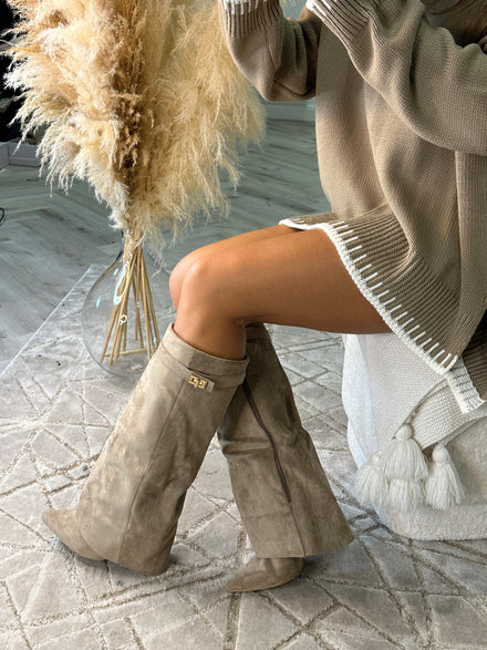 Kasia Knee High Fold Over Heels Boots - Beige