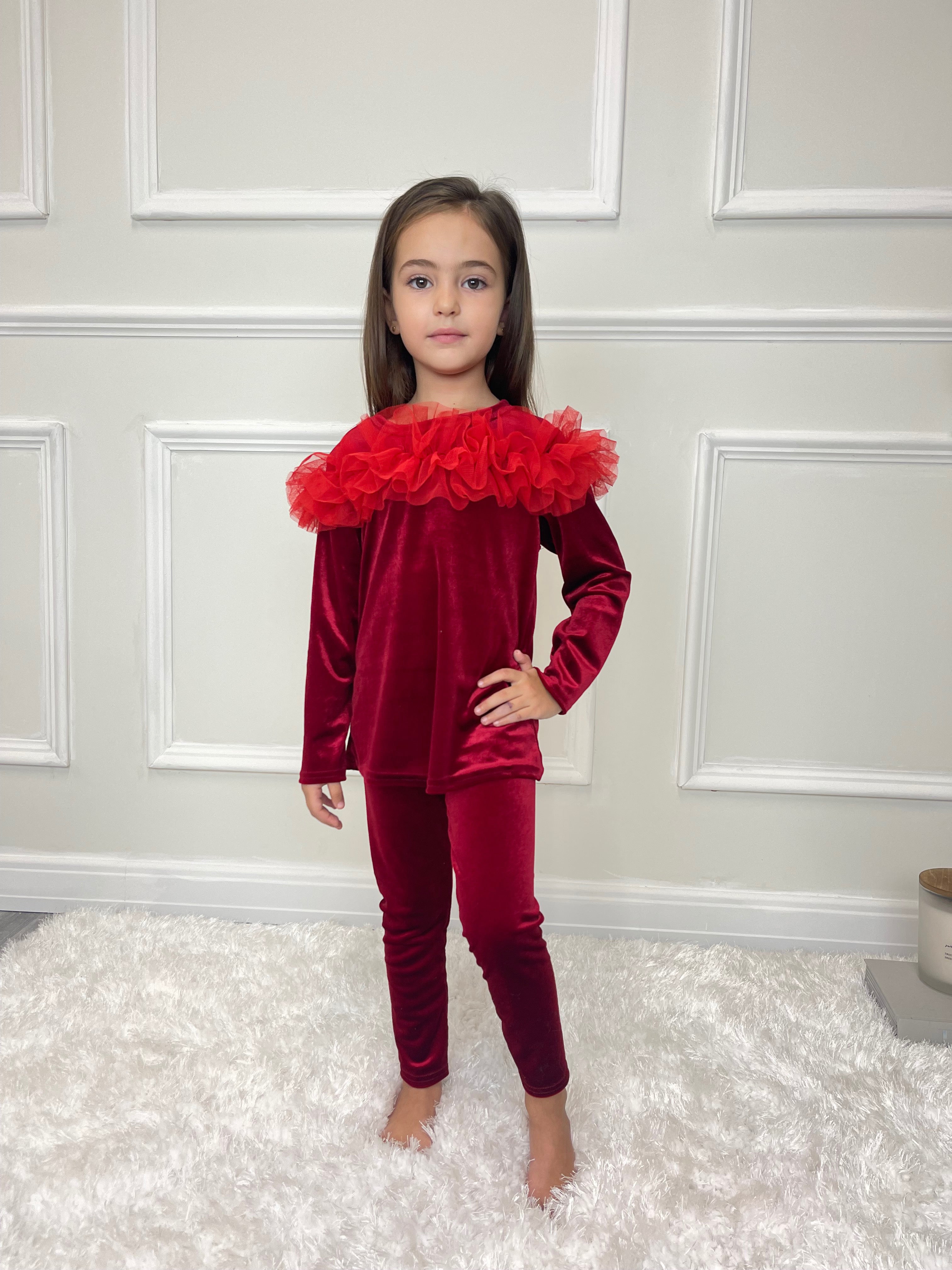 Lexie Kids Velour Frill Detail Trouser & Top Set - Red