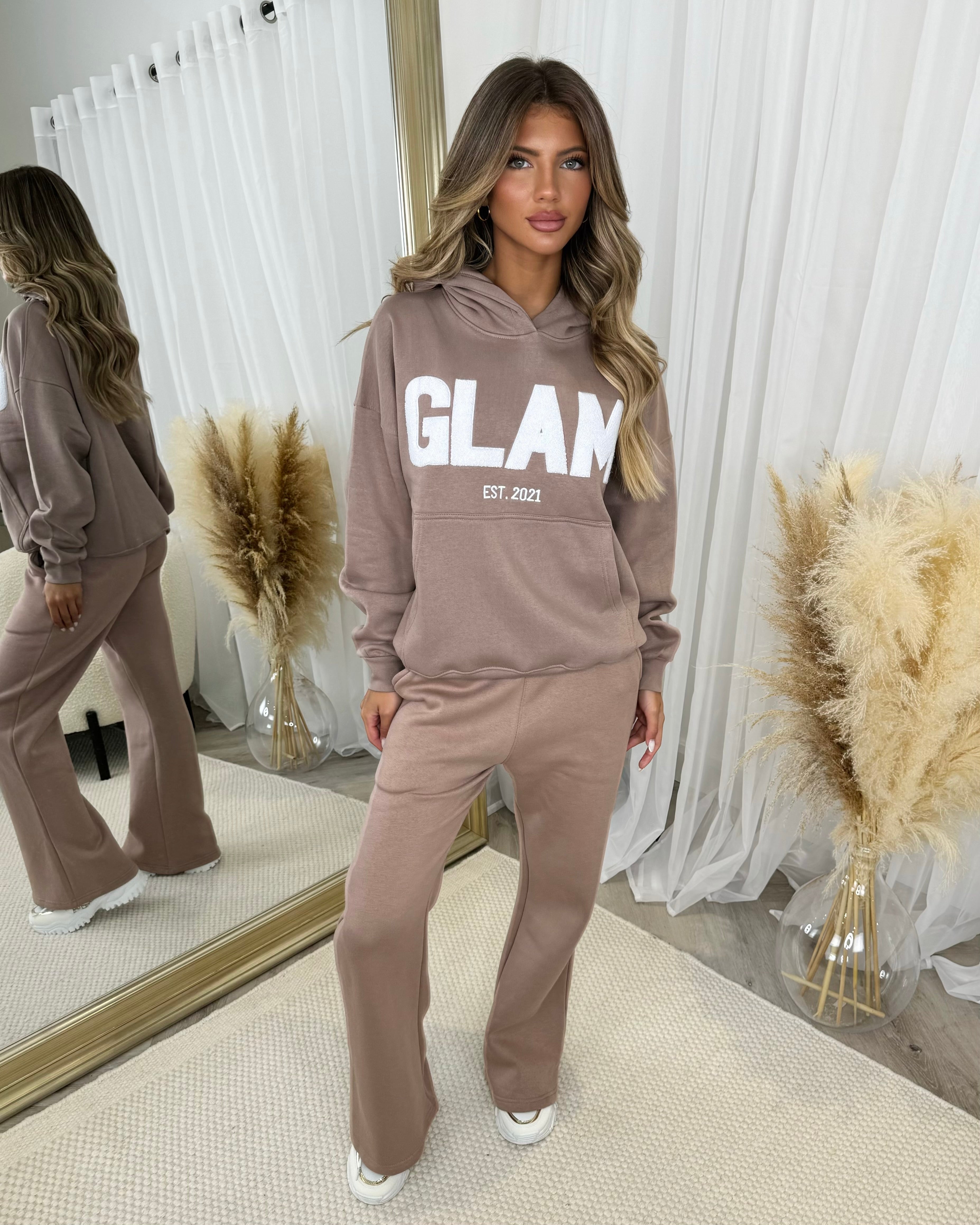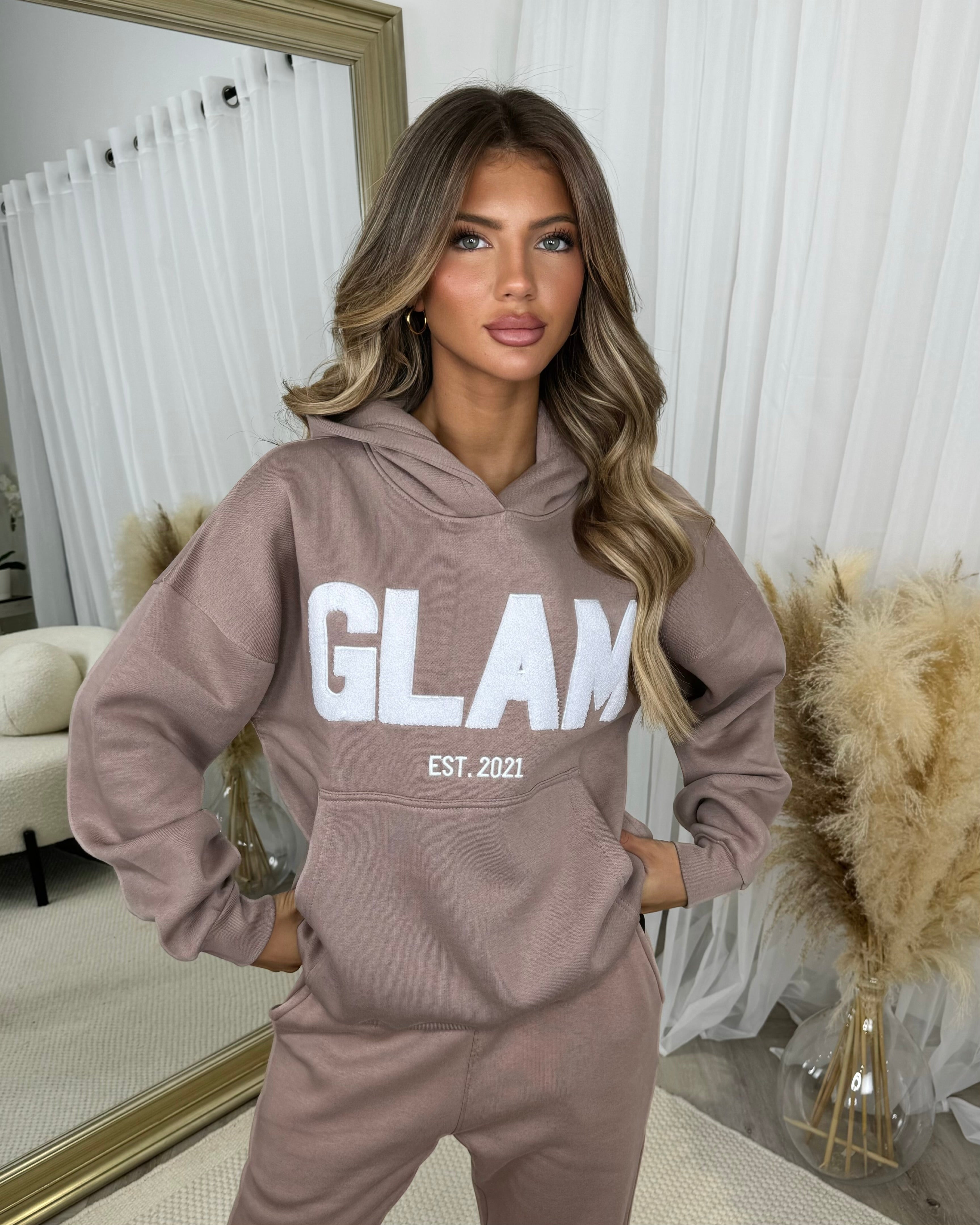 Millie 'GLAM' BOLD EMOBROIDERY Front Logo Print Hoodie - Mocha