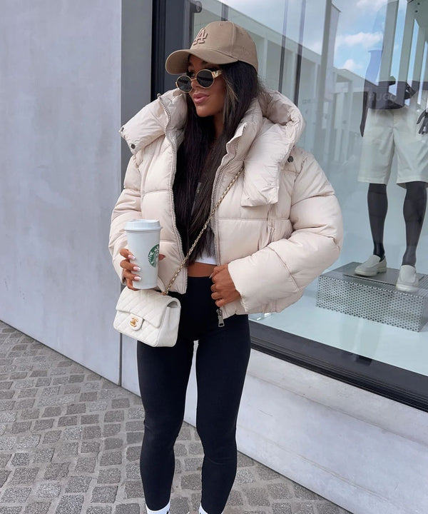 Millie Oversized Short Padded Bomber Jacket with Hood - Beige