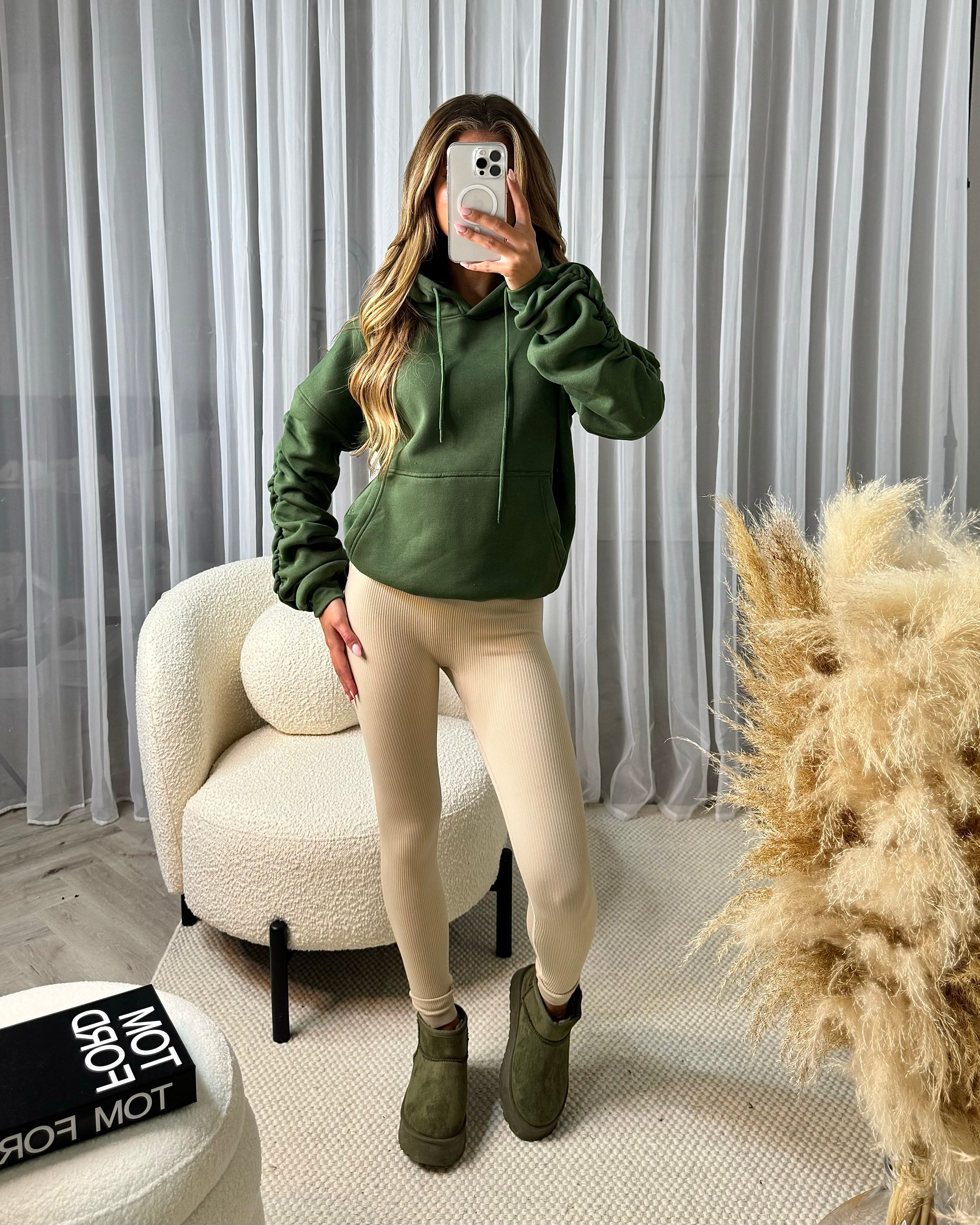 Penny Ruched Sleeve Hoodie - Olive Khaki