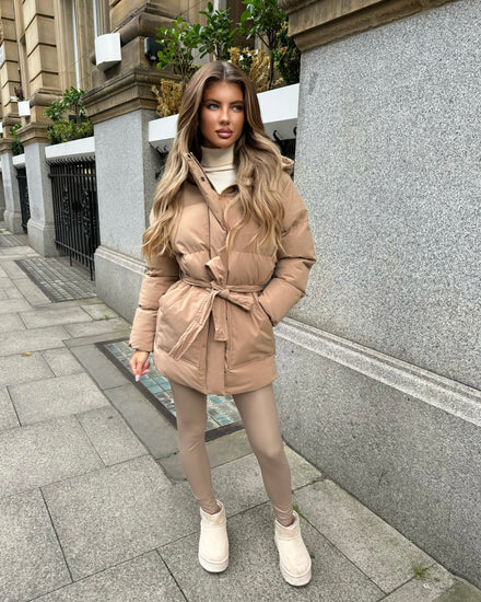 Mia Faux Fur Pull in Waist Long Padded Coat - Camel