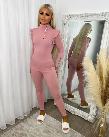 Evie High Neck Gold Button Loungewear Set - Light Pink