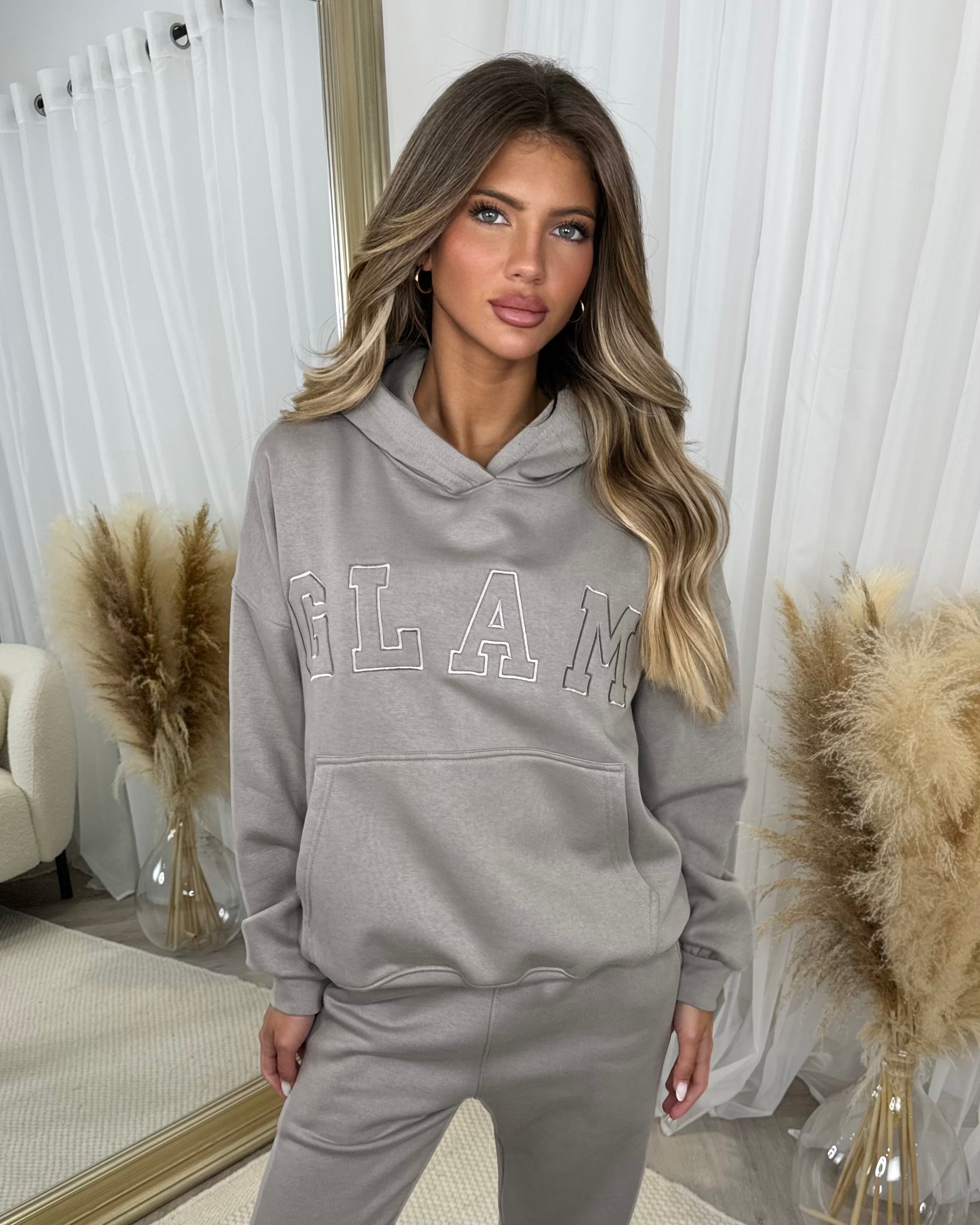 Emily 'GLAM' Embroidery Outline Front Design Fleece Lined Hoodie - Dove Grey