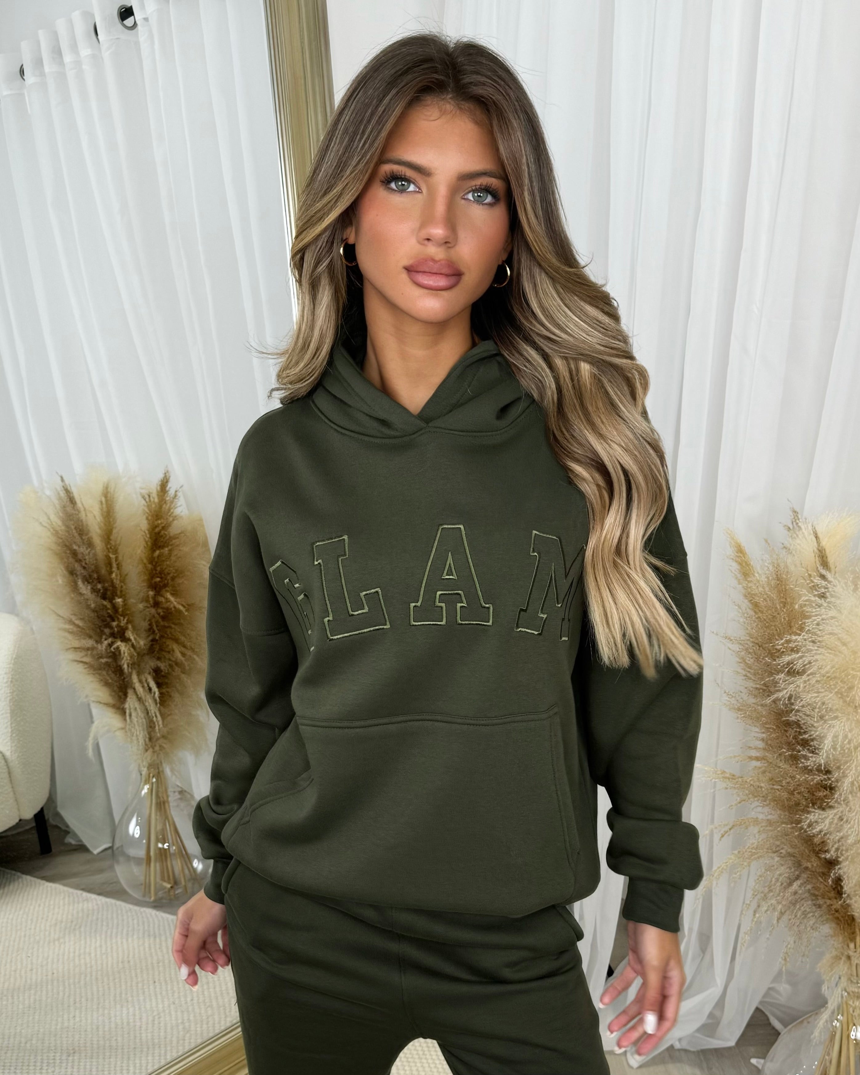 Emily 'GLAM' Embroidery Outline Front Design Fleece Lined Hoodie - Khaki