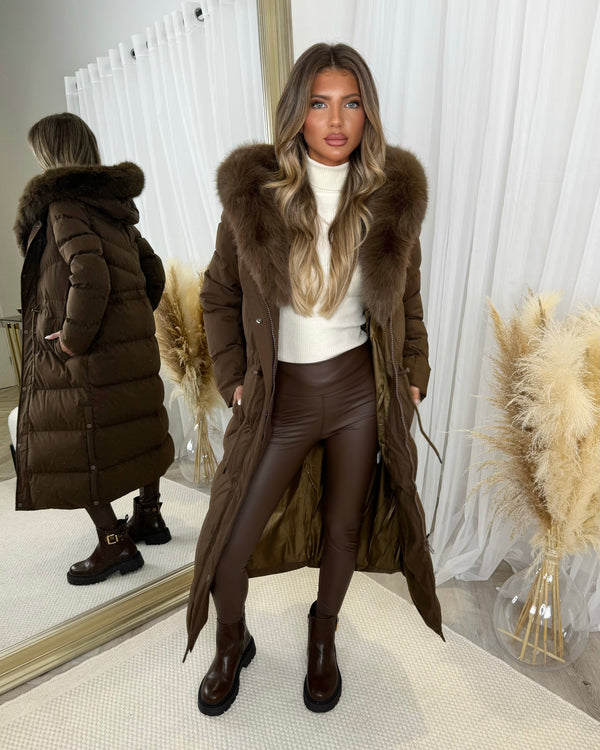Mia Faux Fur Pull in Waist Long Padded Coat - Chocolate