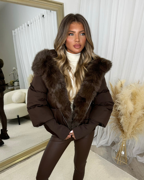 Ruby Hooded Padded Coat with Faux Fur Trim - Chocolate