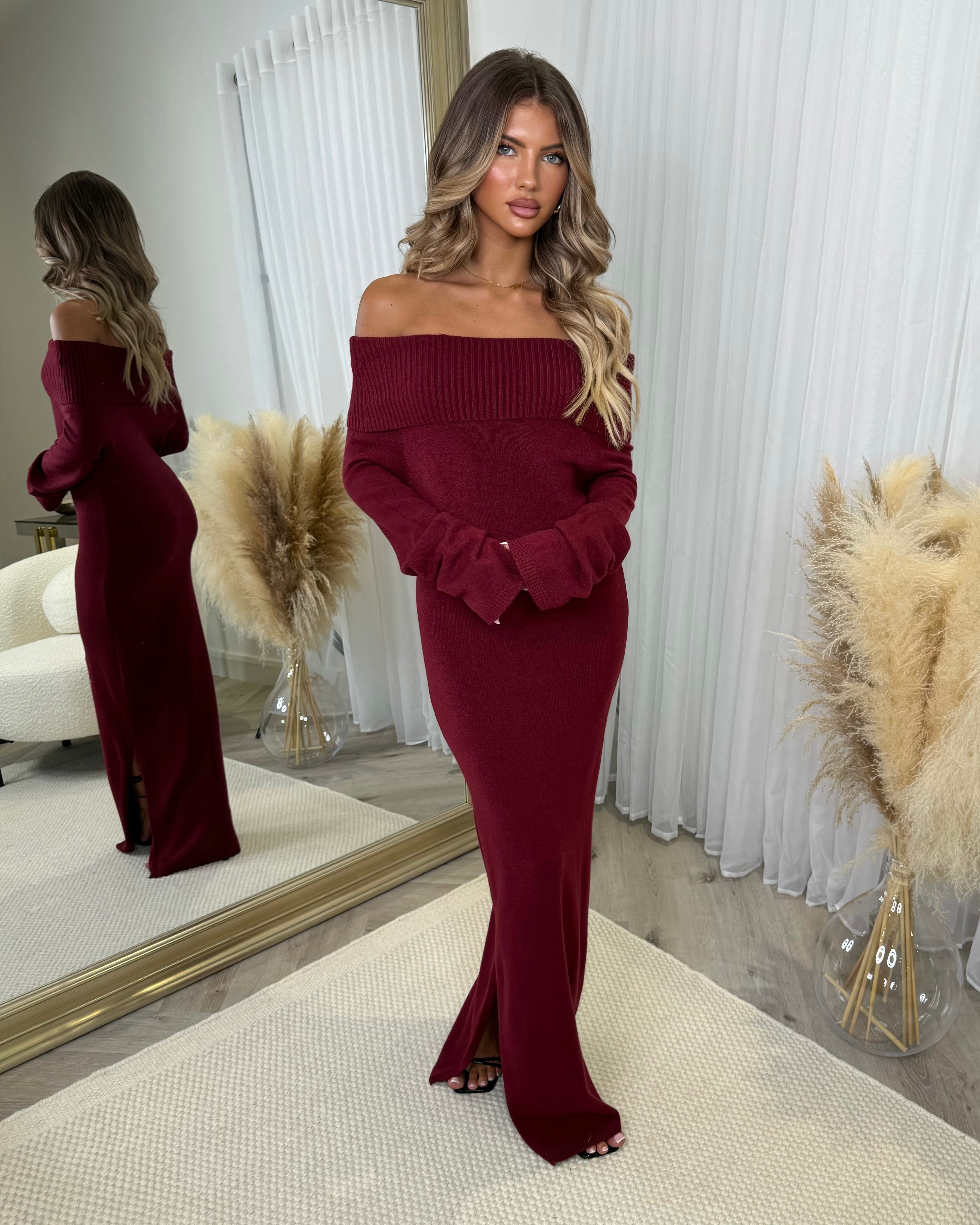 Sofia Cowl Neck Knitted Maxi Dress - Wine