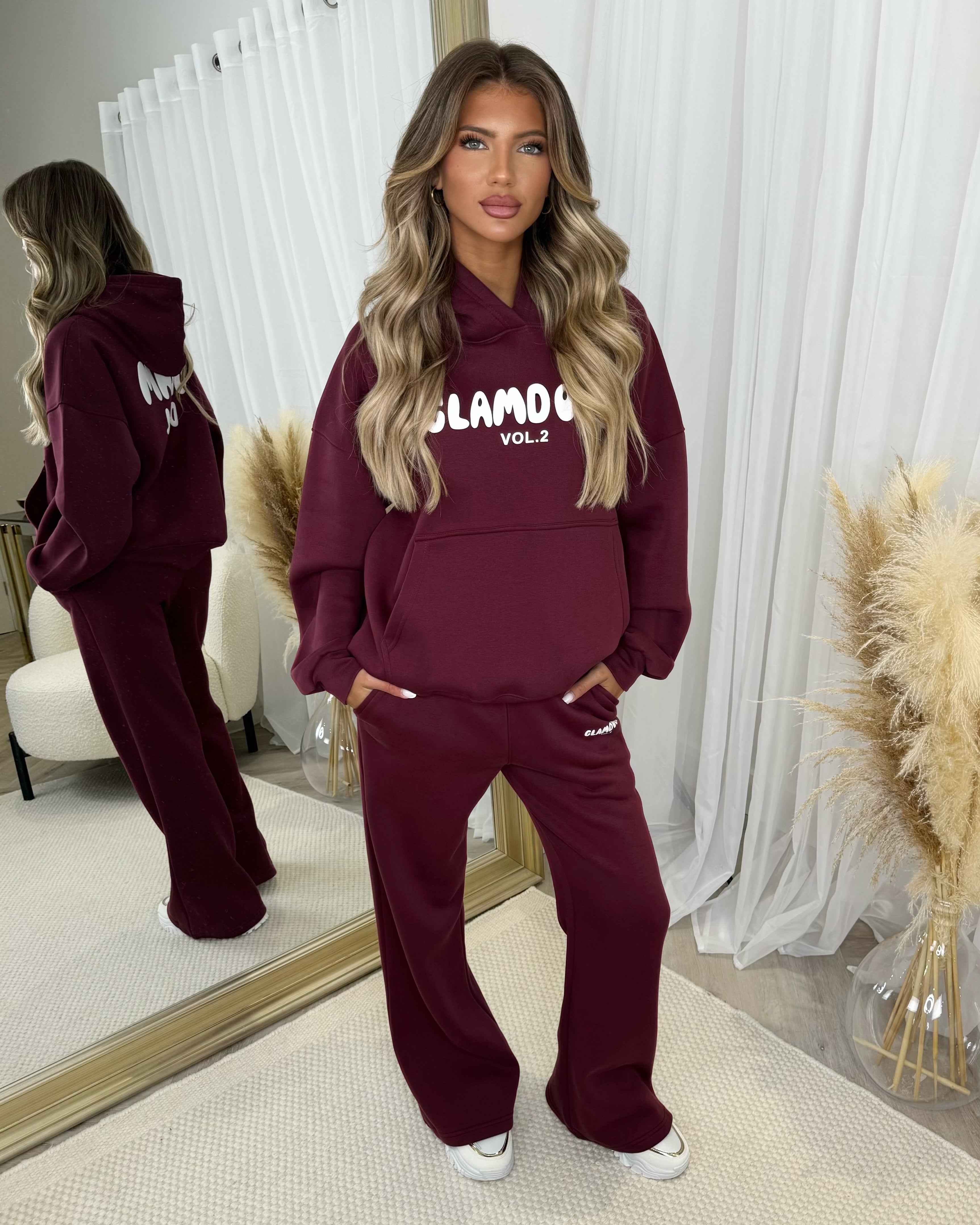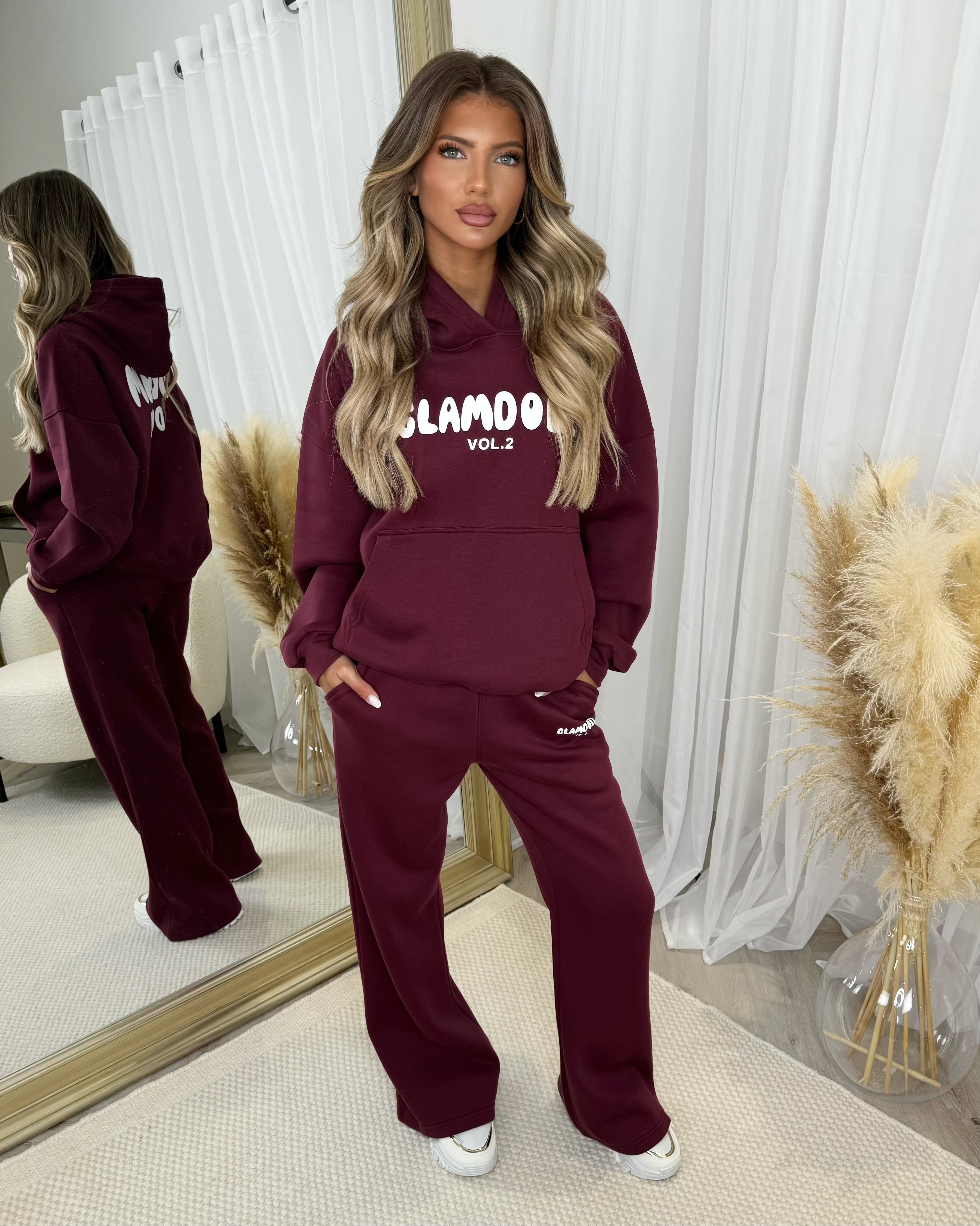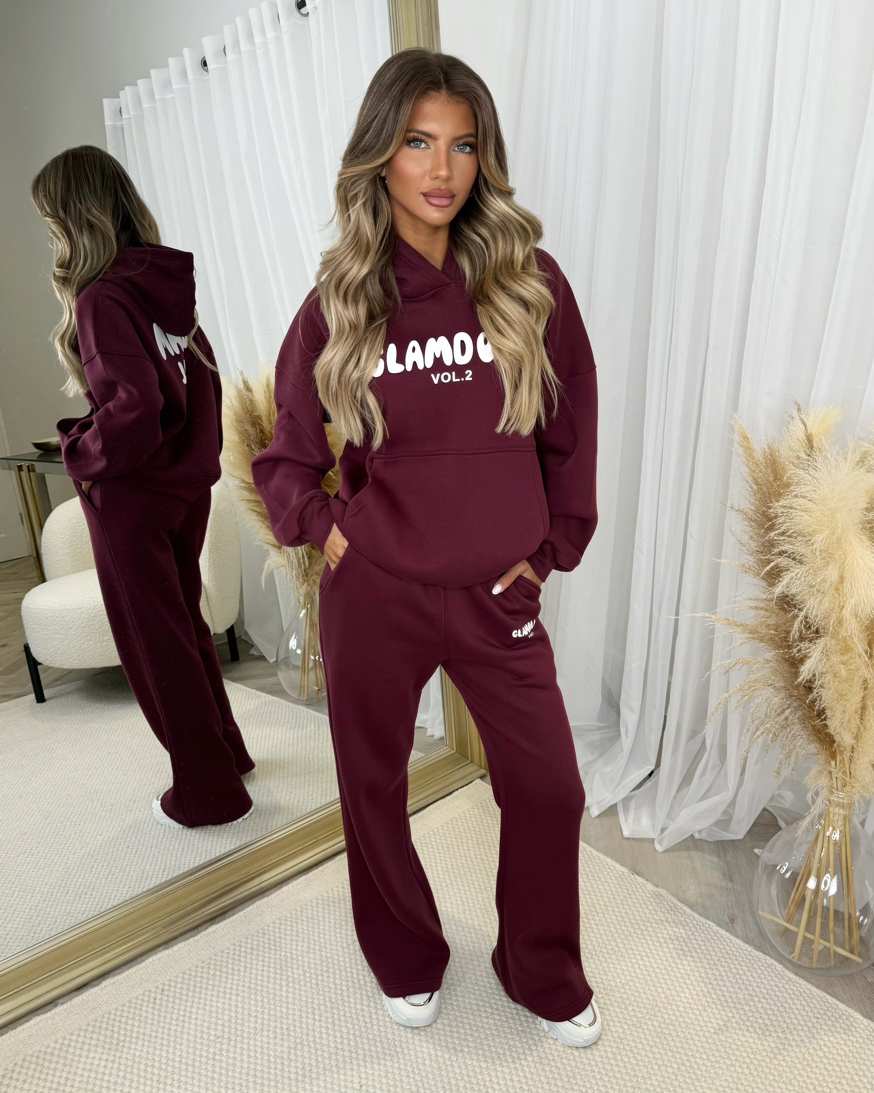 Zoey 'GLAMDOLL' BUBBLE PRINT Design Hoodie & Flared Jogger Set - Burgundy
